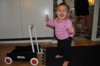Agnes har fått lite nya leksaker på sista tiden. Av farmor fick hon denna fina gåstor. Det går riktigt bra. Hon älskar att fixa med den.